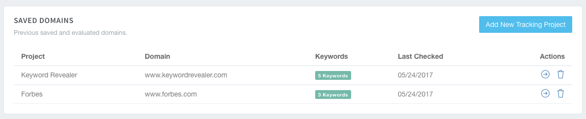 Our Saved Domains section gives our users an overview of the projects they saved. It has five columns to it:
