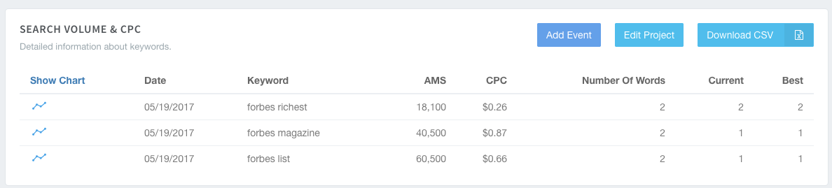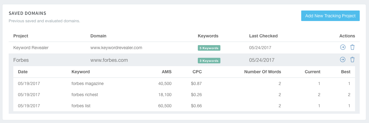 Clicking any of the projects from the Saved Domains overview will reveal the keywords that are tracked within the project and several other details about the keywords like the Average Monthly Searches (AMS), Cost per Click (CPC), Number of Words, the keyword’s current ranking, and the keyword’s best ranking.