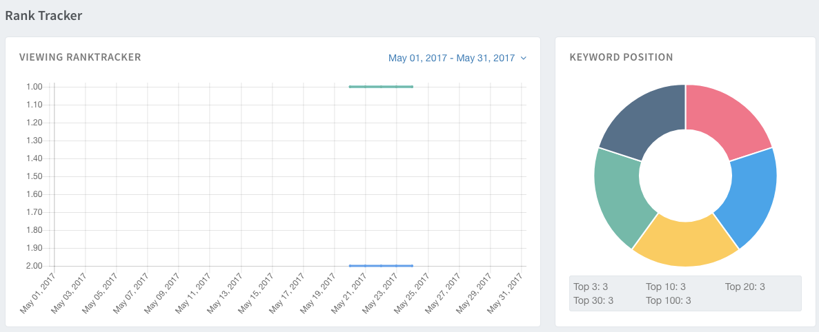 This feature gives you an overview of how many of your keywords are within the top 3, 10, 20, 30, or 100 of the search results. For example, if you have four keywords ranking within the top 3, our system will show “Top 3:4.”