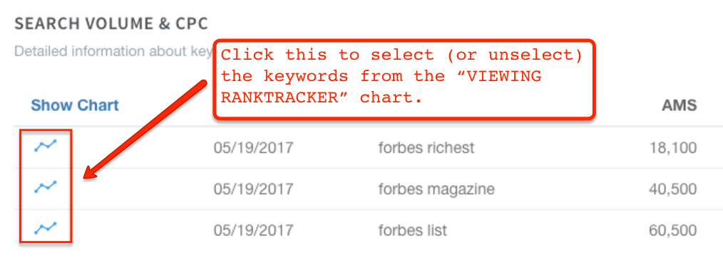 It’s important to note that clicking any of the show chart column trend icons will select/unselect the keyword from the chart.